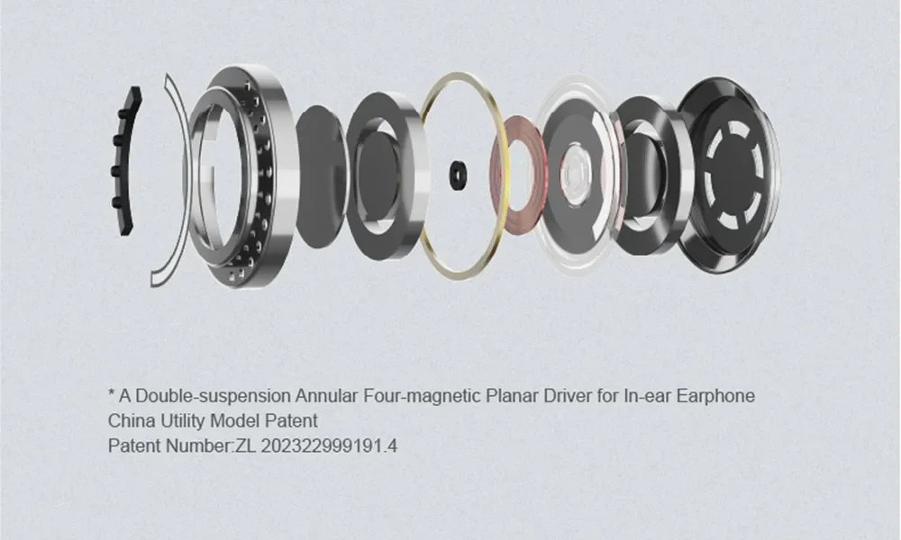 A newly designed 13mm planar magnetic driver with an annular magnetic circuit and annular diaphragm, in conjunction with a magnetic circuit array composed of several N55 high-performance neodymium magnets. together with an annular tiled driving circuit, delivers an effective driving range much larger than that of a dynamic driver, and greatly reduces distortion through its innovative double suspension system, further reducing split vibration by adding a rigid equalizing structure, resulting in an amazing large dynamic and wide-band low distortion under the low power consumption drive of TWS.