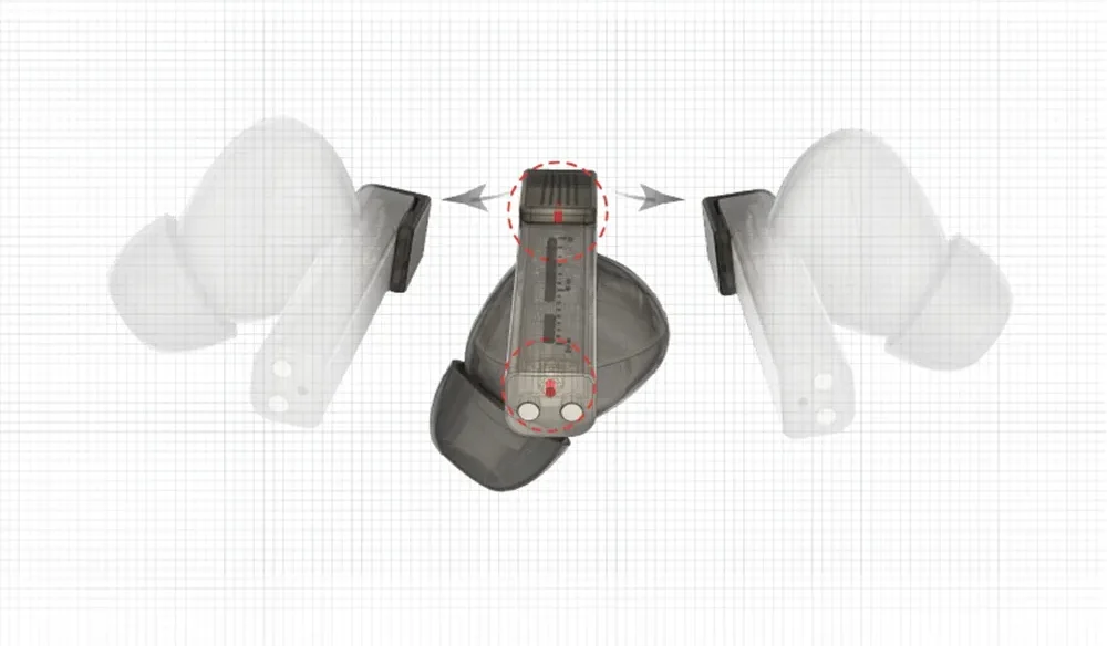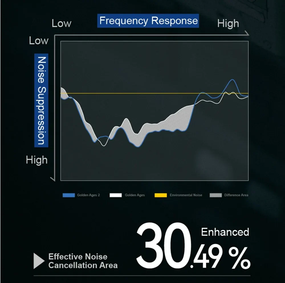 In order to achieve deep noise cancelation, most ANC TWS on the market adopt a hybrid feedforward-feedback scheme. However, the noise collected by the feedback microphone in the front cavity can cause loss of bass, which cannot be completely resolved even by a compensation algorithm. In order to ensure that the sound quality will not be affected when switching noise reduction, Golden Ages 2 abandons feedback noise cancelation, adopting a single feedforward solution that is more difficult to adjust. Relying on the powerful new ultra-high efficiency transducer driver, combined with the microphone structure of special microphone acoustic channel with wind noise cancellation function, and through the built-in DSP adjustment of customized SOC chip, the ANC performance is enhanced by 30.49% compared with the predecessor. Unlike traditional noise reduction adjustments in the market, which often focus solely on the decibel value of noise reduction depth, MOONDROP's approach prioritizes comfort and actual noise coverage. This method considers the comprehensive bandwidth and depth of each frequency band, leading to a significant noise reduction effect while avoiding discomfort, such as ear pressure.