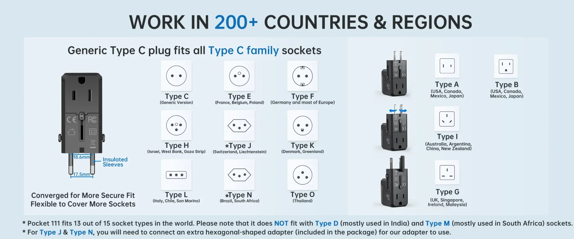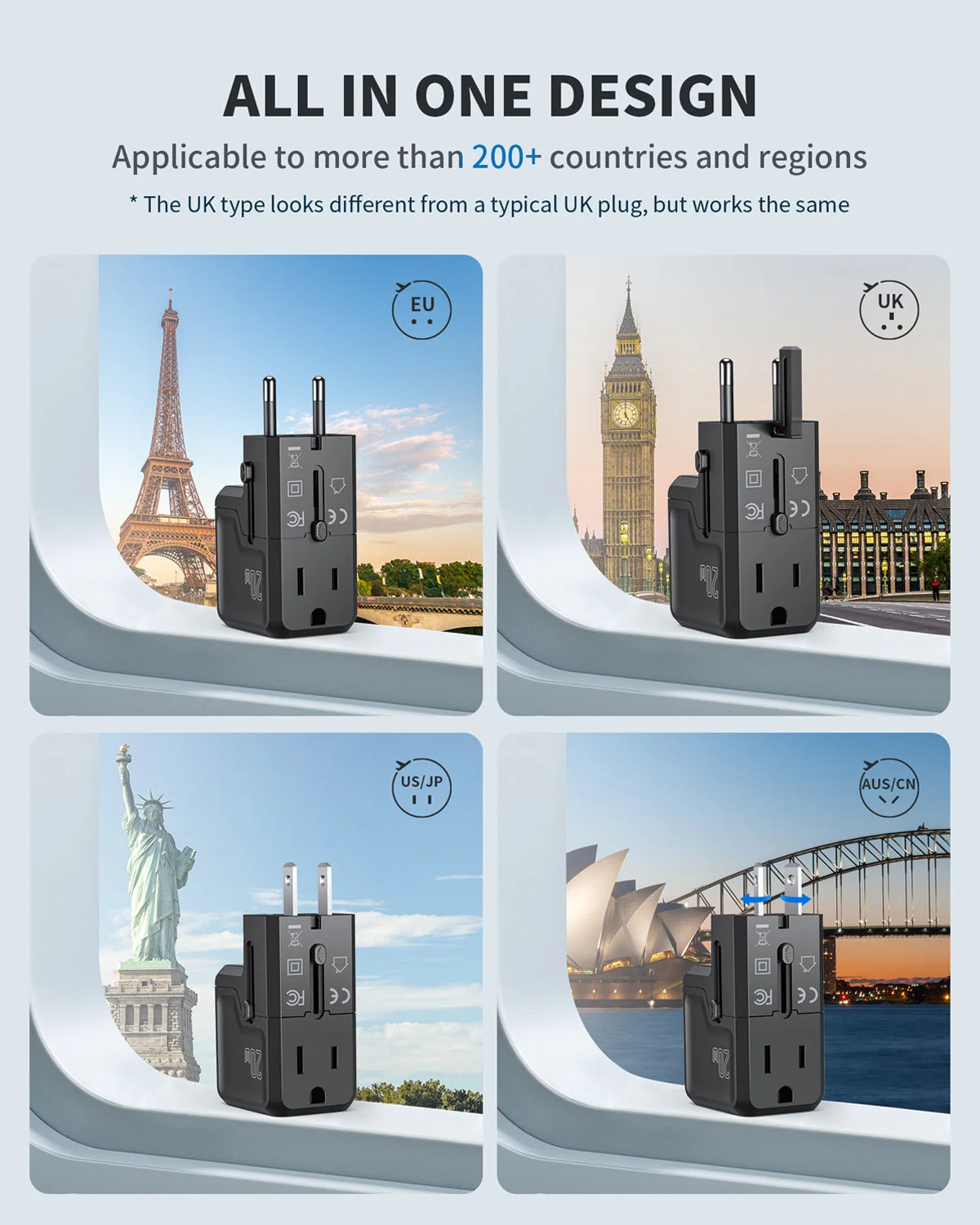 - Global Compatibility: Our all-in-one adapter is equipped with 4 different plug types that could plug into the sockets of 200+ countries & regions