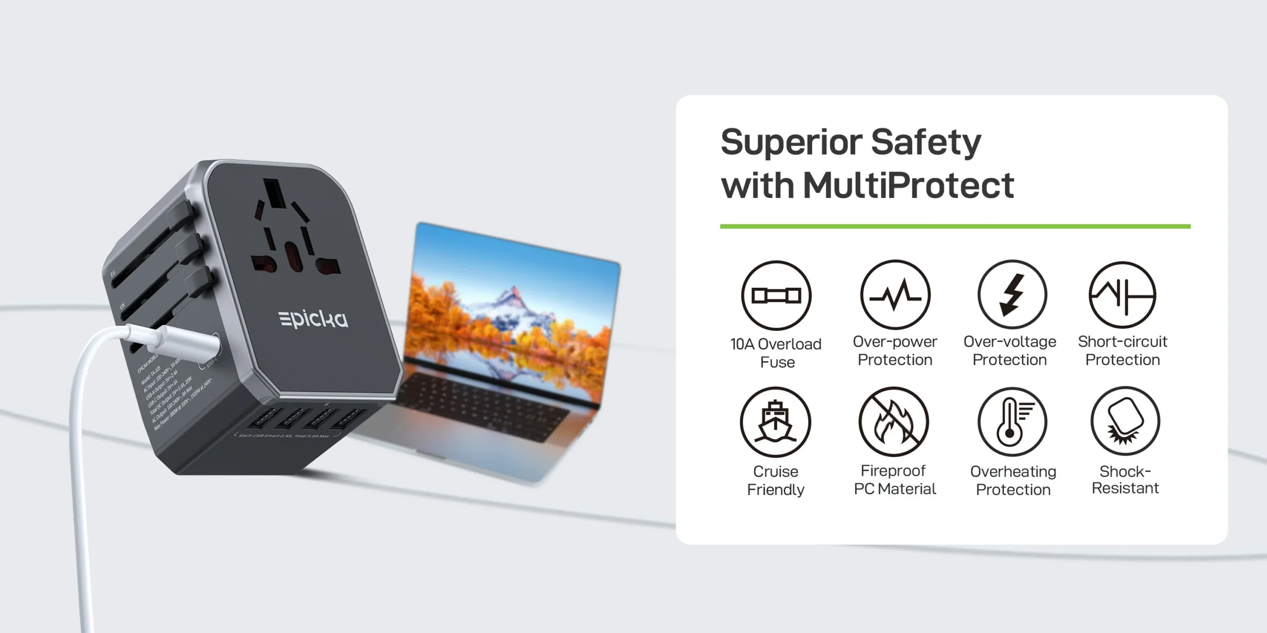 Compatible in 200+ countries, this adapter powers up to 6 devices at once with 4 plug types and versatile charging. Features an upgraded 10A fuse for overload protection, while USB ports stay active even if the fuse blows. Built-in safety shutters, plug lock, and RoHS, CE, FCC certifications ensure secure, cruise-friendly use.