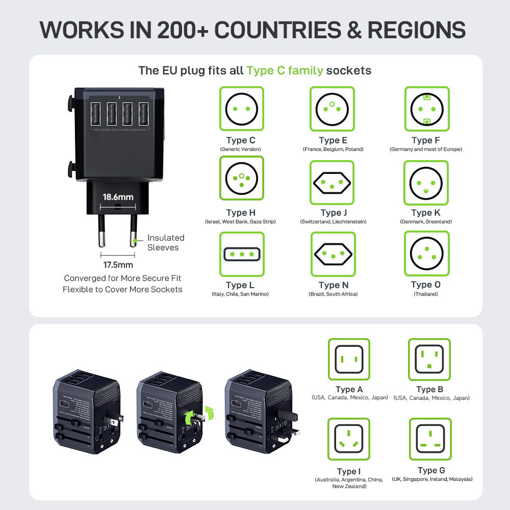 - Global Compatibility:Â All-in-one adapter includes 4 different plugs that adapt to 200+ countries & regions.