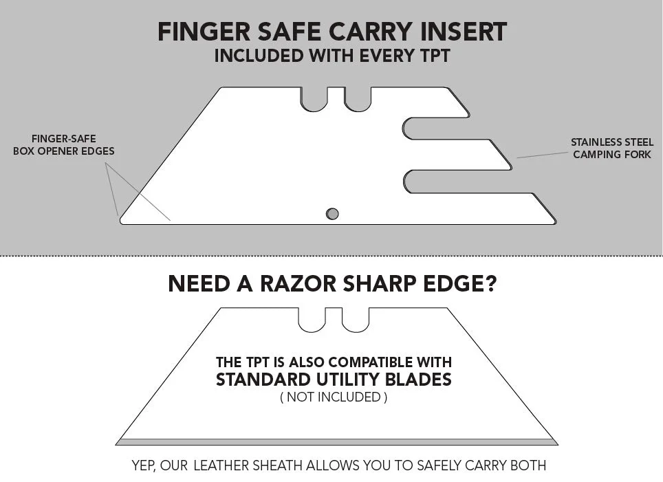 On the new version, we have added an EZ swap door on the back of the TPT for easy and quick blade changes. This applies to models with EZ Swap in the name. We’ve made the body 25% thicker for strength, and added a slide lever at the top for quick and easy access to the insert. It’s now even easier to carry, thanks to the removable pocket clip. All of this is in addition to the the tools on the original TPT.