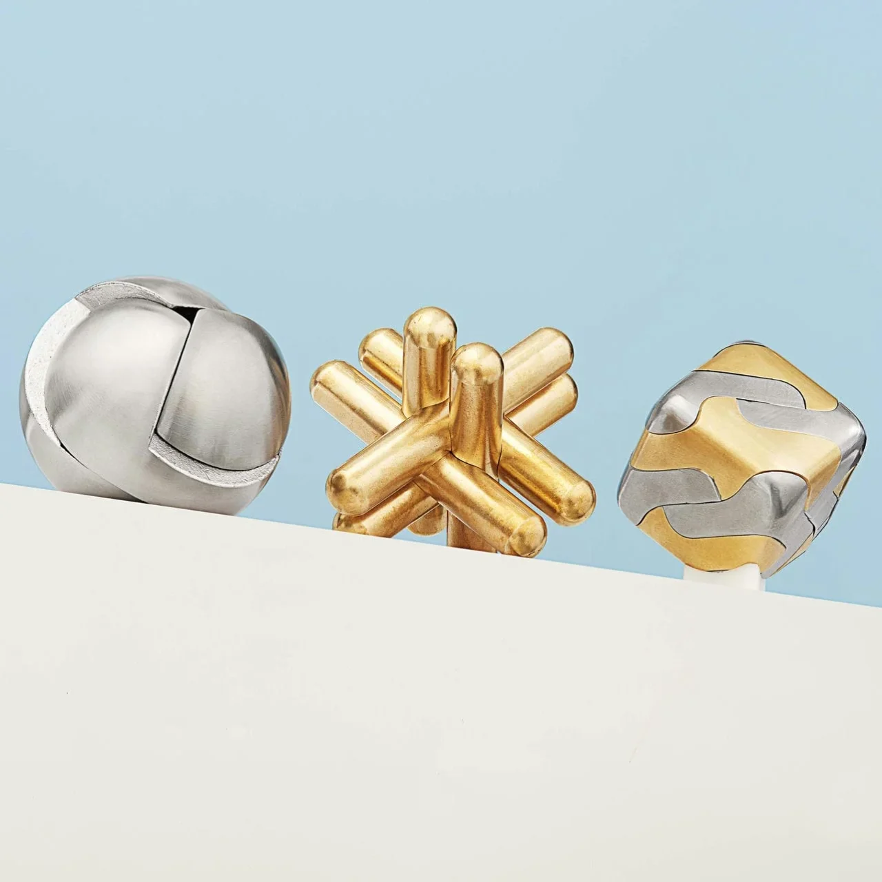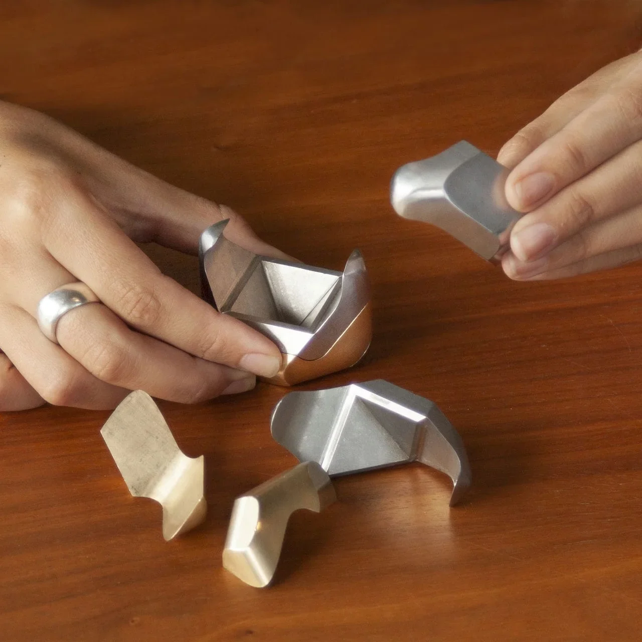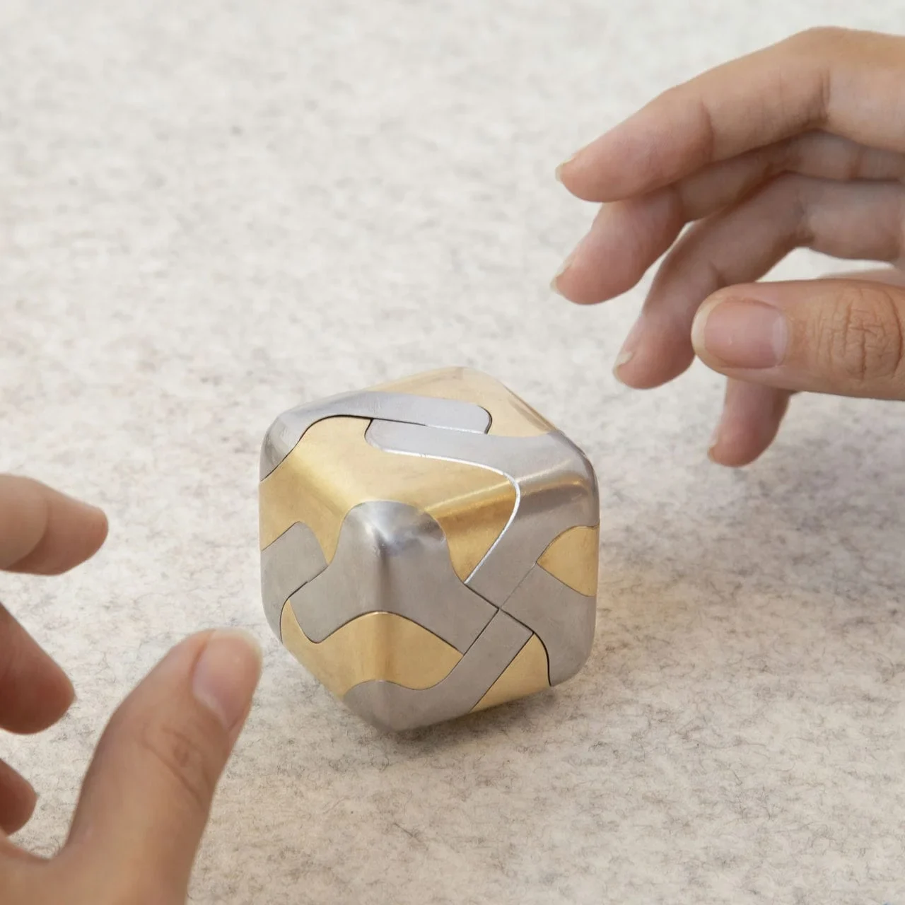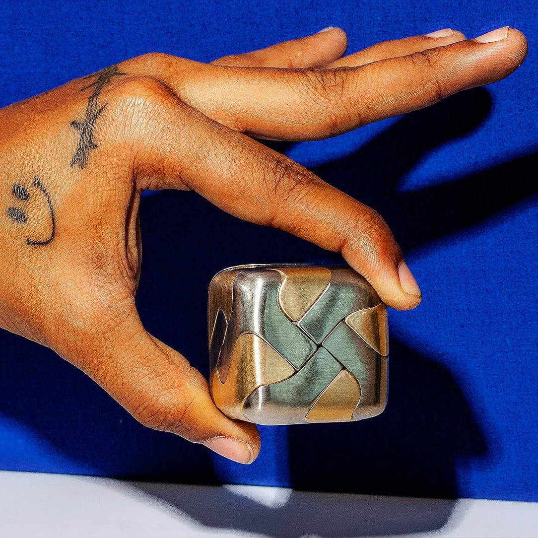 The Tycho Puzzle is a tactile exploration in form, function, and hidden complexity. Composed of eight individual pieces made from brass and stainless steel, the components come together to form a subtly rounded cube—a compact object that feels as much like a sculptural artifact as it does a brain-teasing challenge.